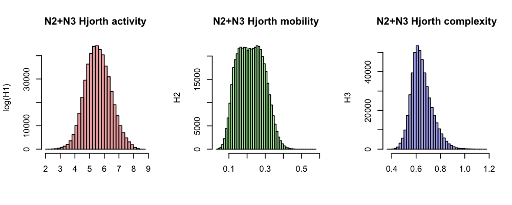 That is, as expected, comparing N2 and N3 metrics confirms that N3 sleep comprises more higher amplitude (H1) and slower (H2) oscillations. We'll use these Hjorth statistics in the plots below, to put the post-interpolation QC results in context.
